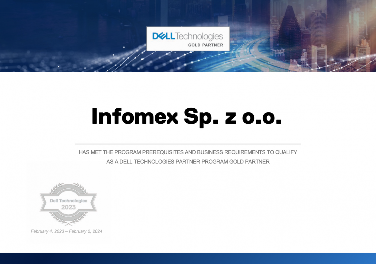 Miło nam poinformować, że otrzymaliśmy po raz kolejny status na poziomie Gold Partner Dell Technologies na rok 2023! Aby uzyskać status GOLD Partner Dell Technologies musieliśmy potwierdzić swoje wysokie kompetencje techniczne (wymagania szkoleń i certyfikacji) oraz handlowe (wymagania sprzedażowe).
